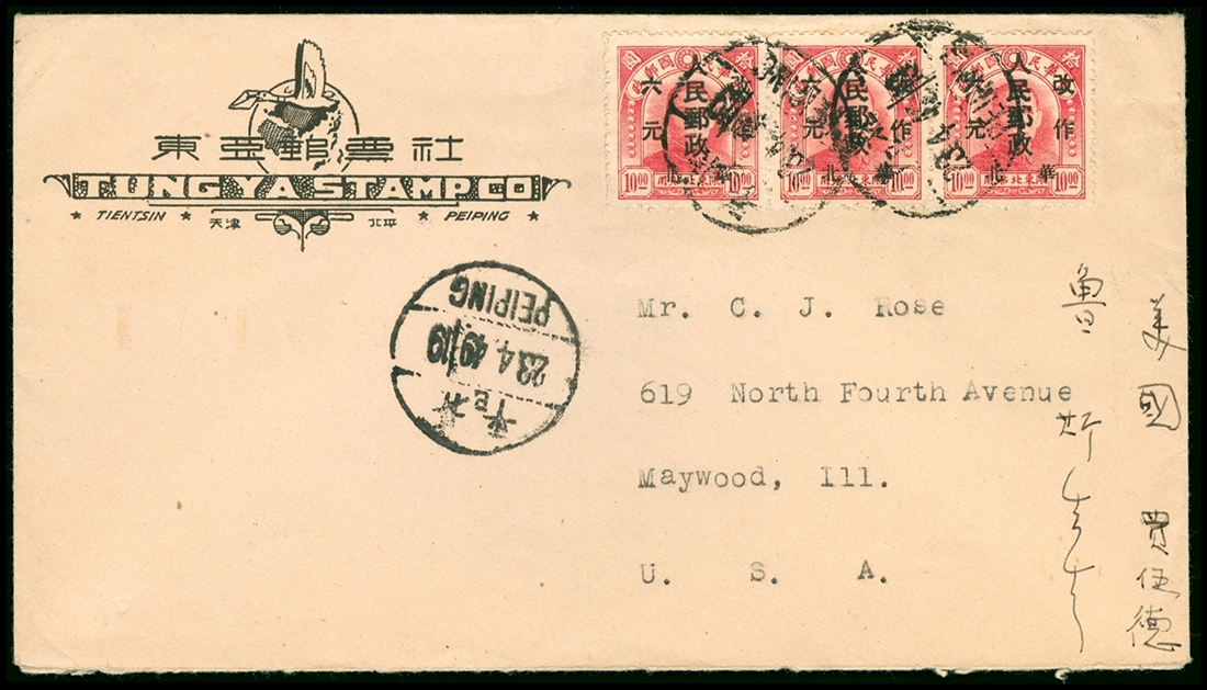 People's Post: 1949 First Peking Surcharge: 1949 (23 Apr.) commercial envelope to U.S.A. bearing $6 on $10 horizontal strip of three tied by Peiping c.d.s.; paying the $18 foreign letter rate. Fine. JPS HB32. Photo