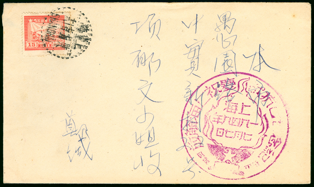 1949 (7 Jul) cover to local bearing Train and Postal Runner $15 tied by Shanghai c.d.s. and commemorative chop alongside.