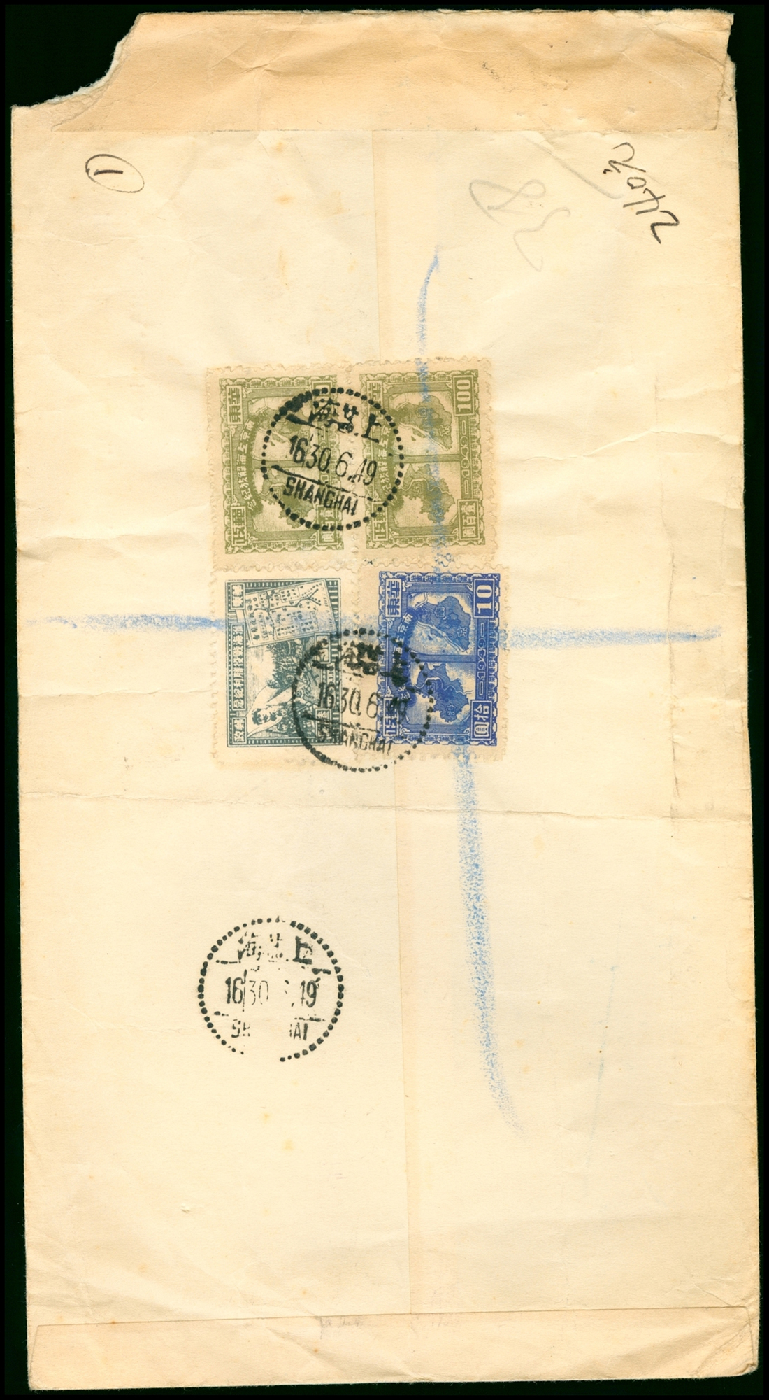 1949 (30 June) registered cover to UK, franked with East China issues, total $240 rate tied by Shanhai c.d.s.