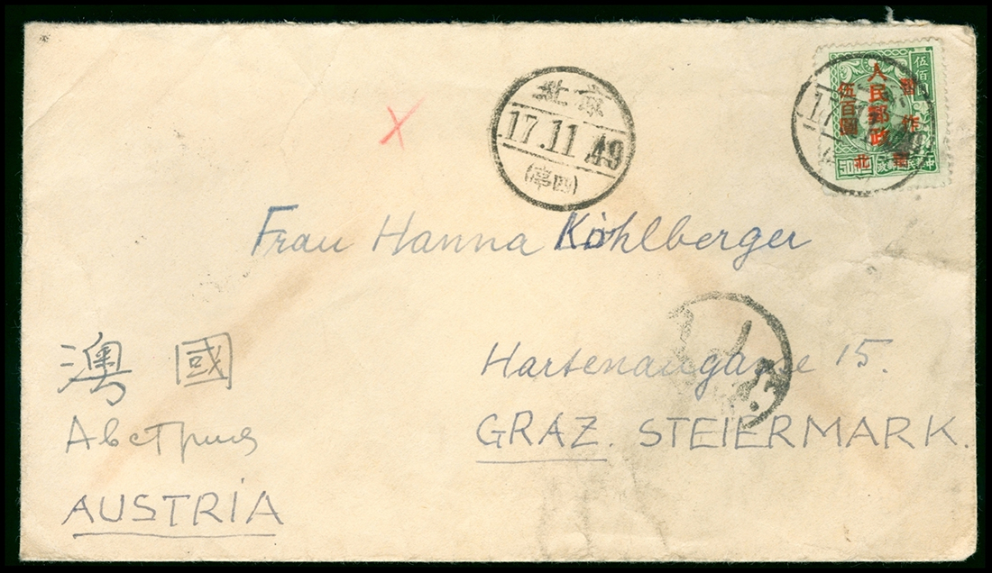 1949 (17 Nov.) envelope to Austria bearing $10 on $500 green tied by Peking c.d.s. and showing Hong Kong transit (28.11) and Graz arrival (9.1).