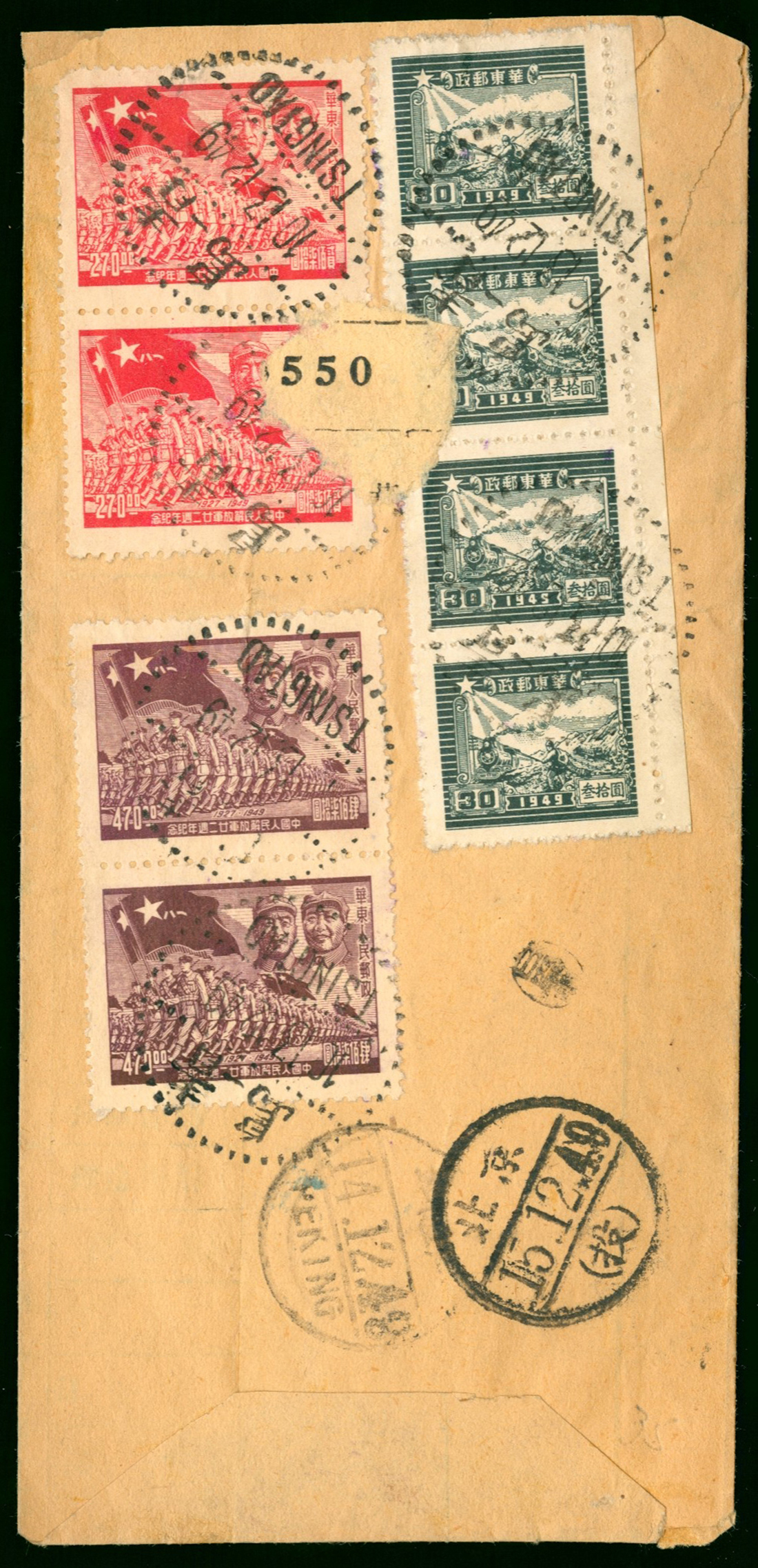 1949 (13 Dec) registered cover to Peking bearing $1600 rate tied by Tsingtao c.d.s. 2 Peking arrival c.d.s.