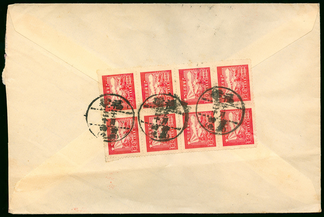 1949 (20 Dec) cover to Foochow bearing Postal Runner and Train $50, block of eight, tied by Putien missing year c.d.s.