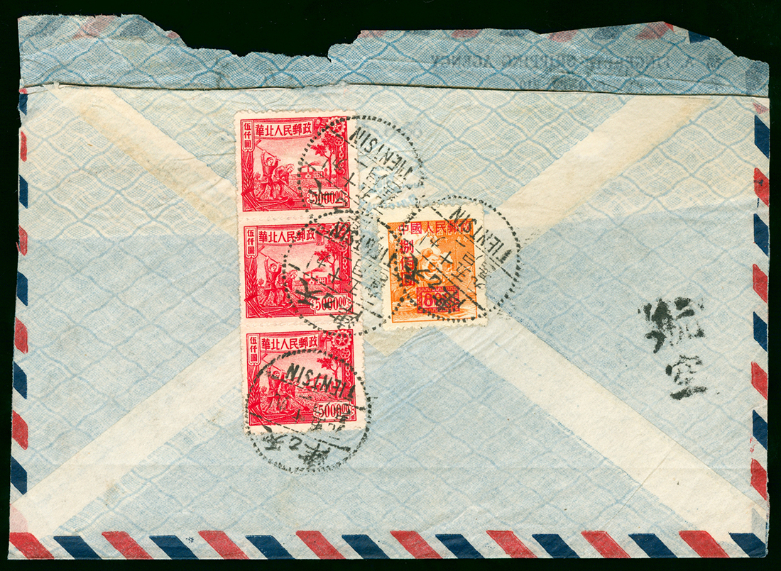 1950 (11 May) airmail cover Tientsin to US.; damaged edges.