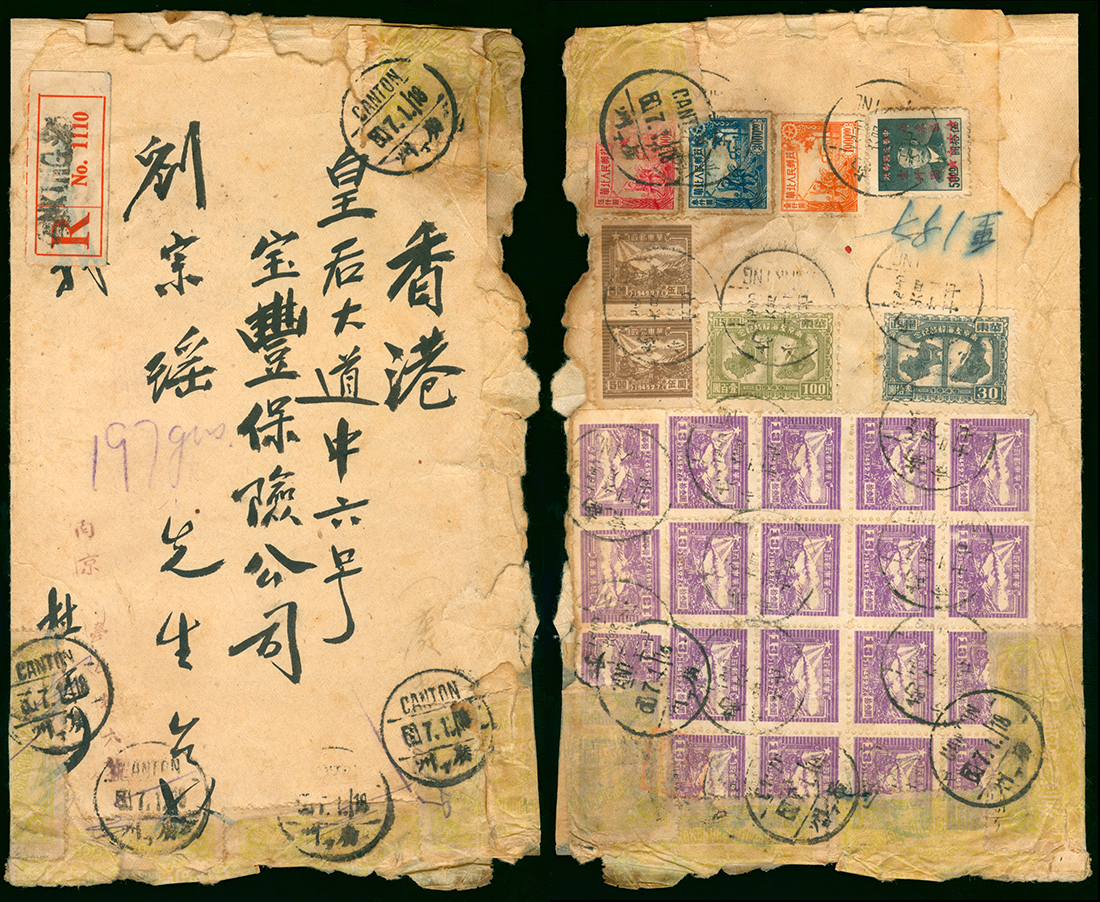 1949 (23 Jun) registered cover to Hong Kong via Canton bearing various East and North China issues total rate $10400 tied by Nanking c.d.s. cover damaged in Canton with 5 seal labels tied by Canton (1 Jul) c.d.s.