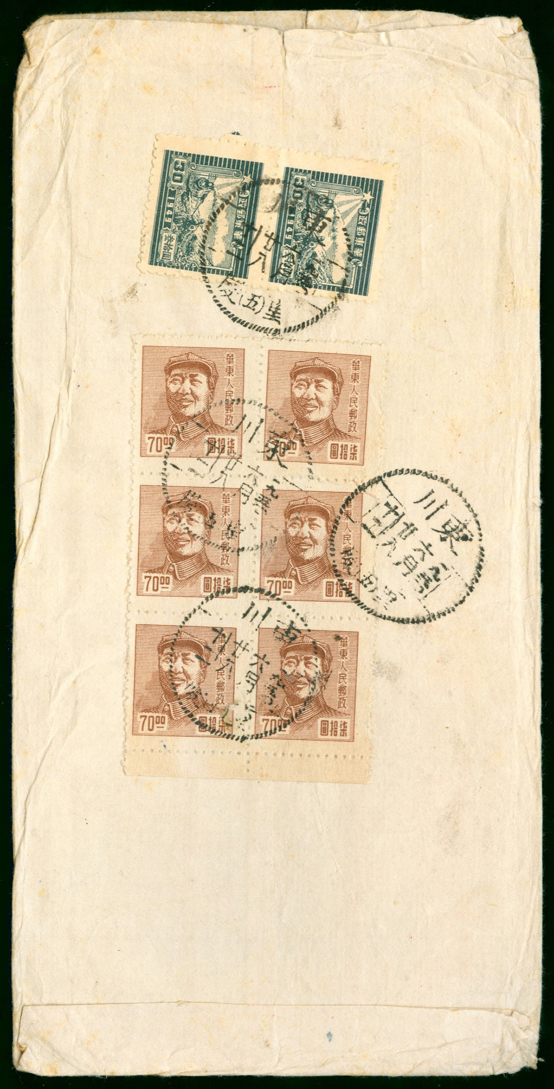 1950 (28 Jun) cover to Foochow bearing East China Chairman Mao $70 block of six and pair of Train $30 tied by Chungking c.d.s.