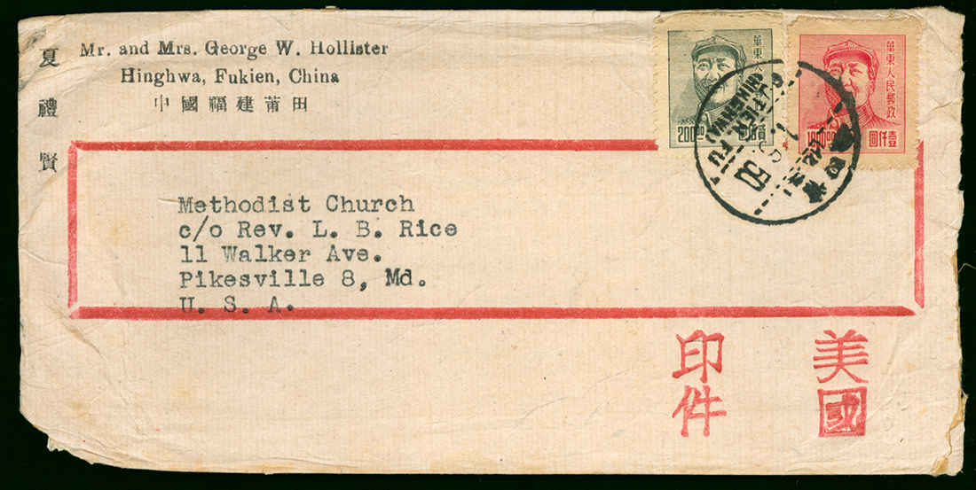 1950 (1 Jun) cover to U.S.A. bearing Chairman Mao $200 and 1000 tied by Putien c.d.s.