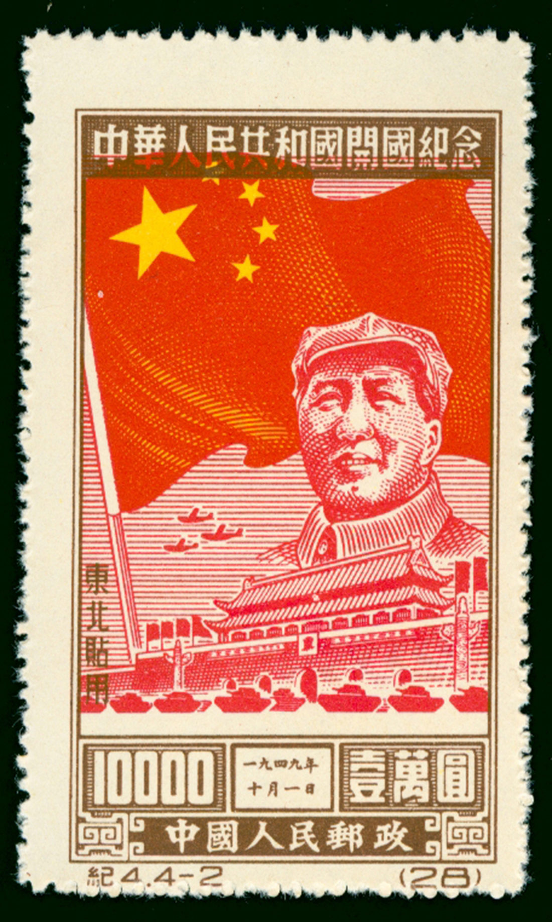 1950 C4NE Inauguaration of Chinese People's Republic $10000, reprint, brown colour shift down to perforation variety, unused.