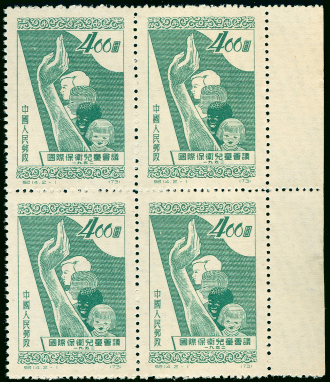 1952 C14 Child Protection, $400 green perf. 14x 12½ variety, 4 blocks and 5 singles unused plus horizontal pair with imperf between variety, unused