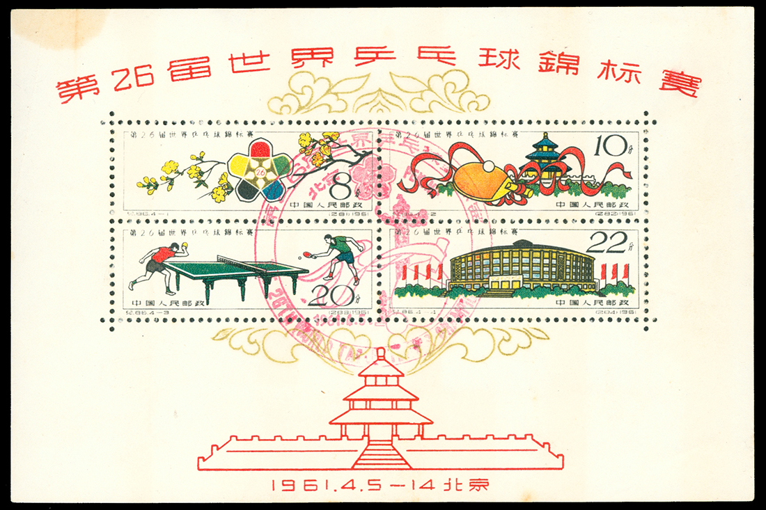 1961 26th World Table-tennis Championships (C65M), Peking miniature sheet tied by 26th World Table-Tennis Championship first day red chop, folded in central, toned gum, SG 1971a