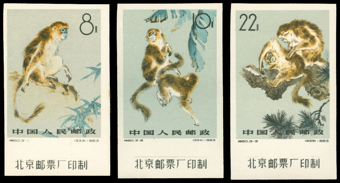 1963 Snob-nosed Monkeys (S60), set of three, unmounted mint with lower imprint margin, fine.