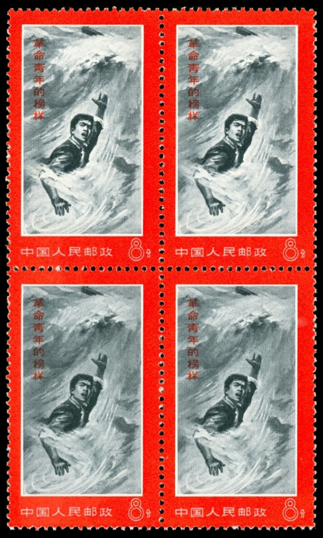 1970 Example of Rovolutionary Youth (W18), blocks of four, black water, mint, very fine.