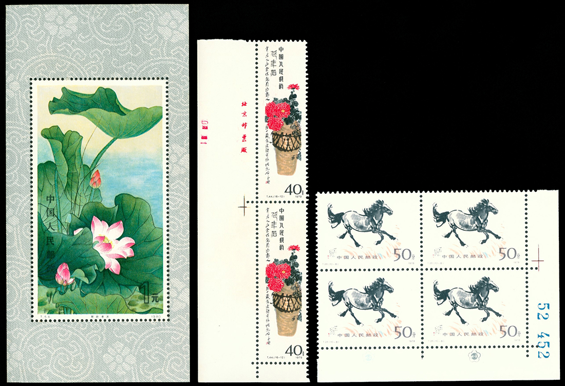 1978 Horses (T28), corner block of four, Qi Baish (T44) vertical strip of two, lower left corner with imprint plus Lotus (T54) souvernir sheet, unmounted mint; toning