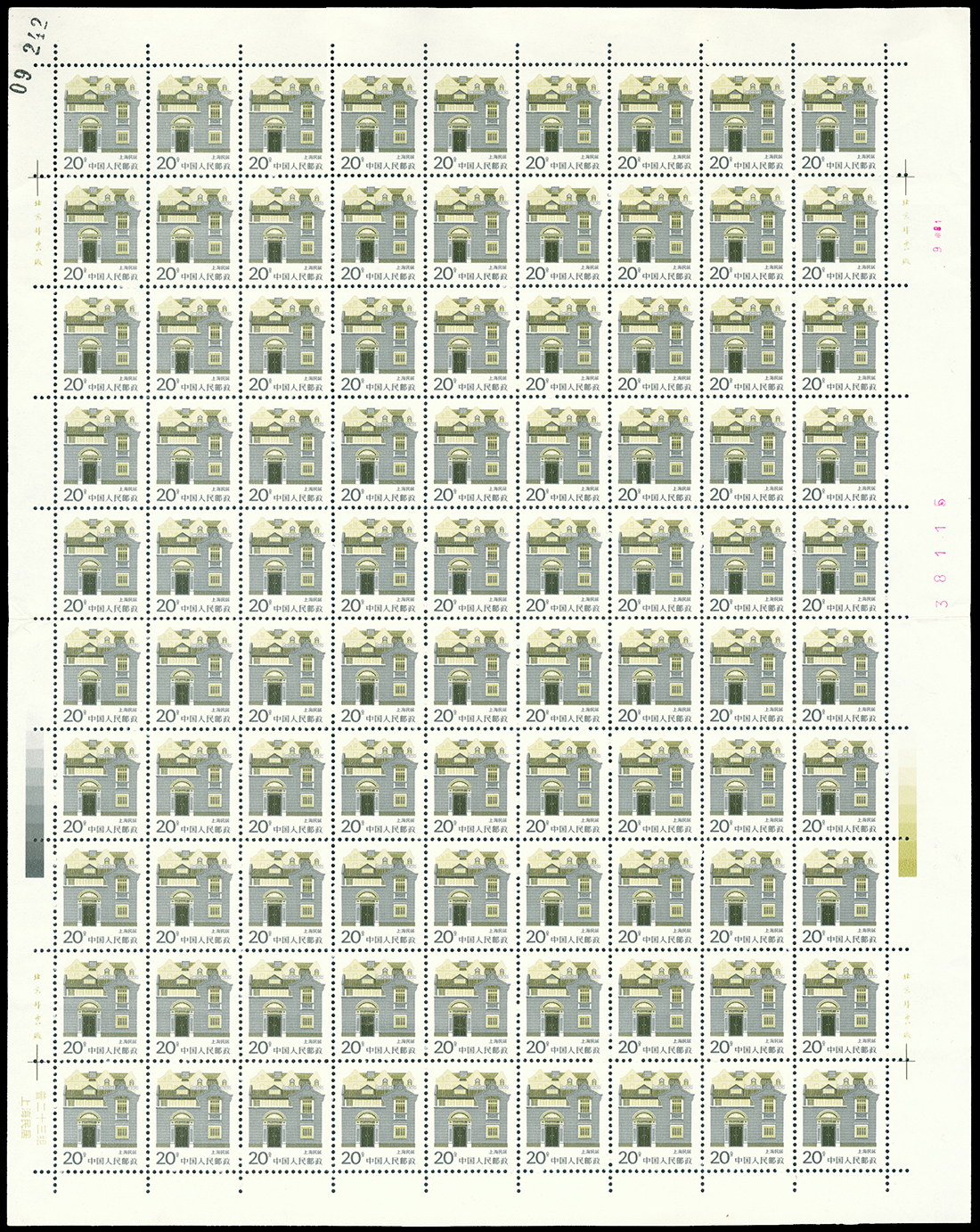 1986 R23 Folk House 20f. Shanghai in full sheet of 100, printed on gum side variety, unmounted mint, very fresh