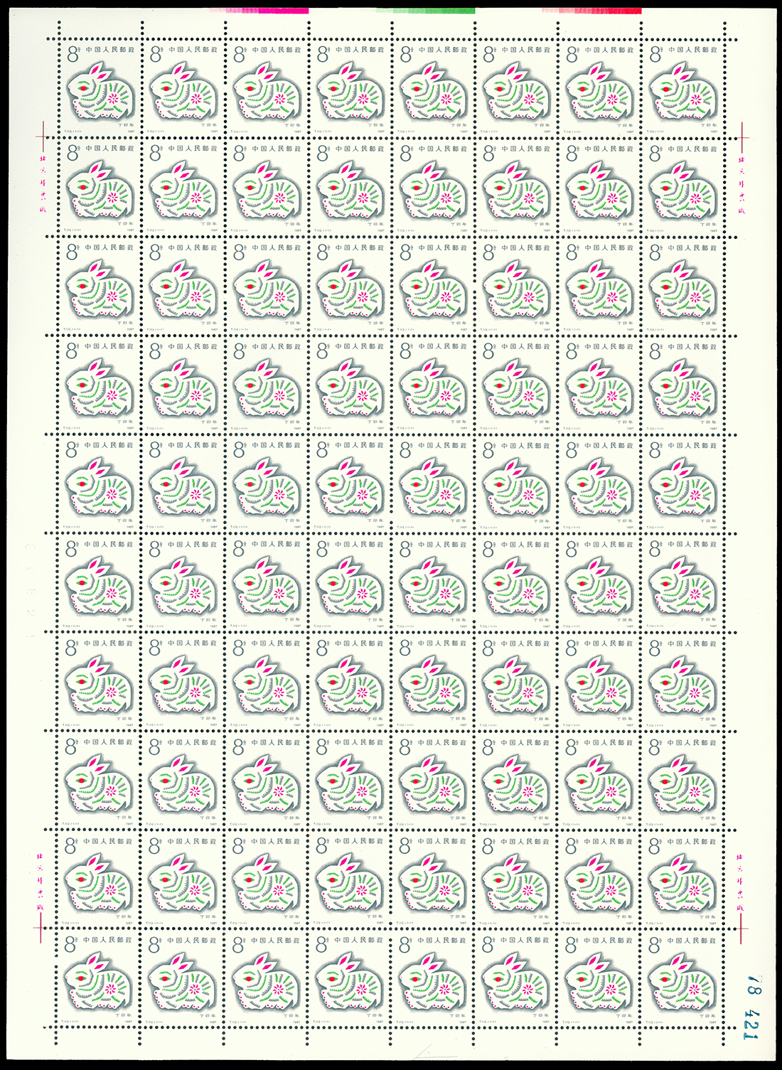 1987 T112 year of the Rabbit, complete sheet of eighty (10), very fresh