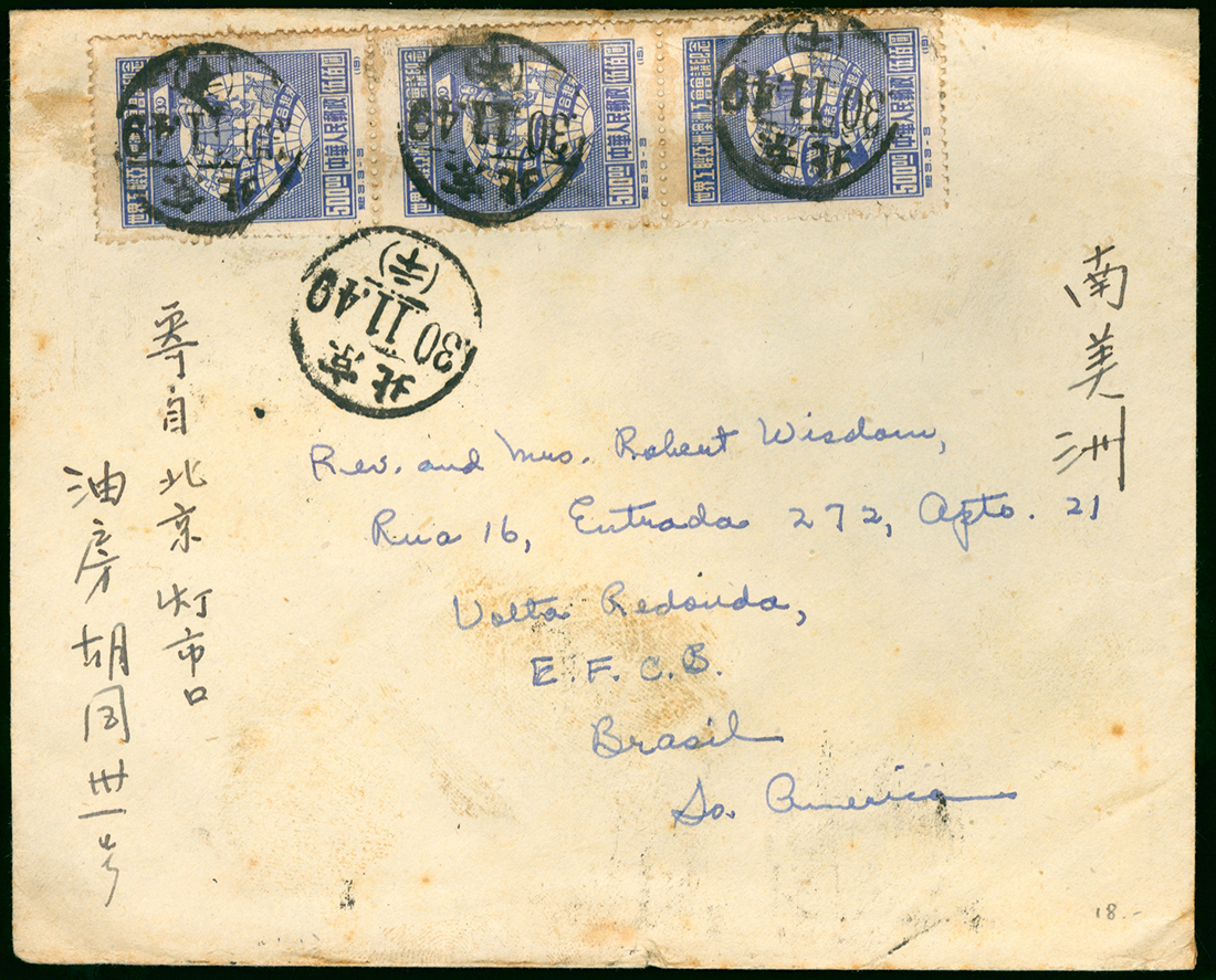 1949 (30 Nov) cover to Brasil bearing C3 $500 vertical strip of three, tied by Peking c.d.s. Brasil (20 Jan 50) c.d.s., very scarce destination.