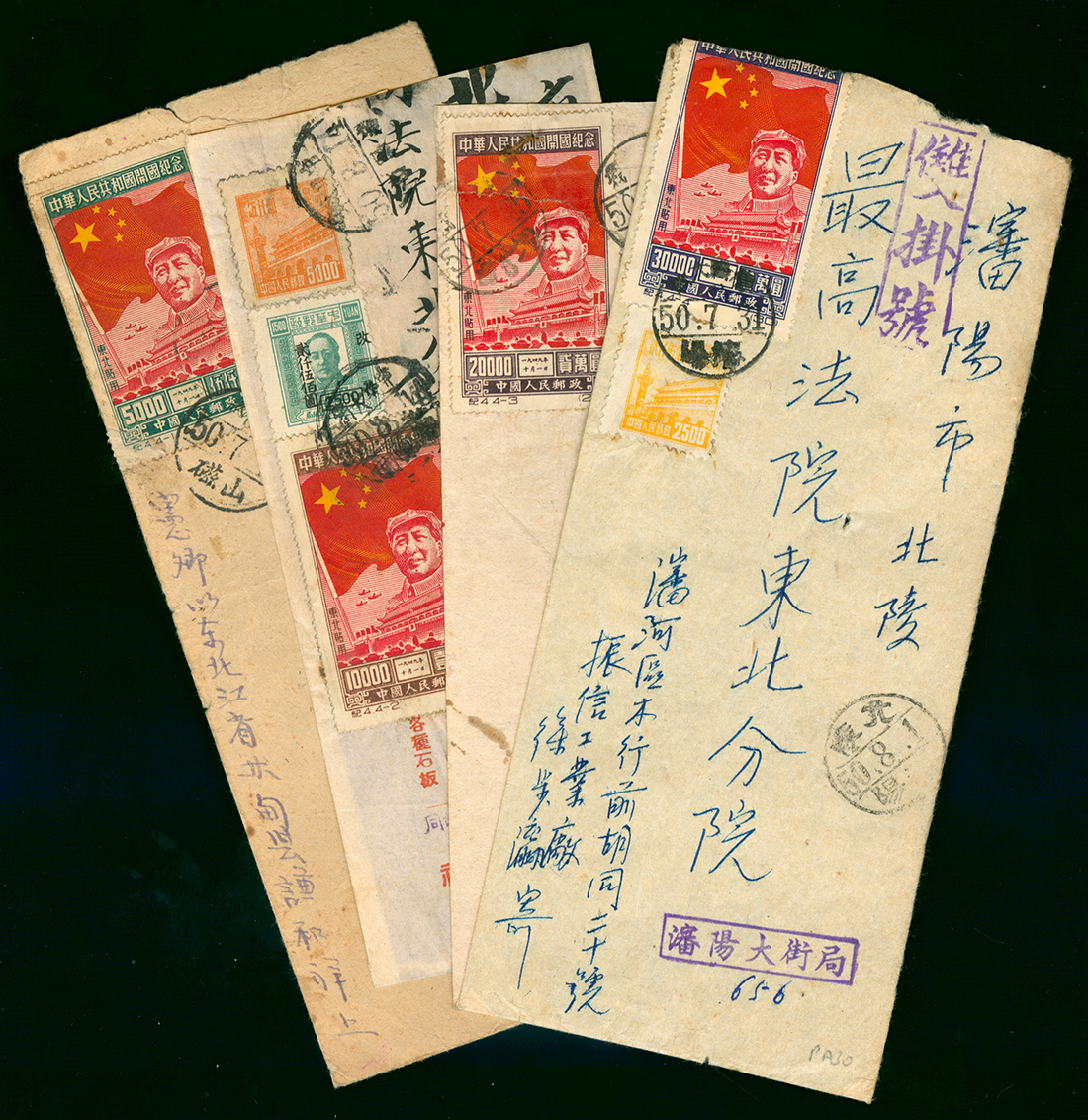 1949-50 Four NE PRC covers, each franked with a different NEC4 stamps, including two regis. Cover, one double regis. Cover with the top value $30,000.( damaged), rare on cover . A rare set to complete.