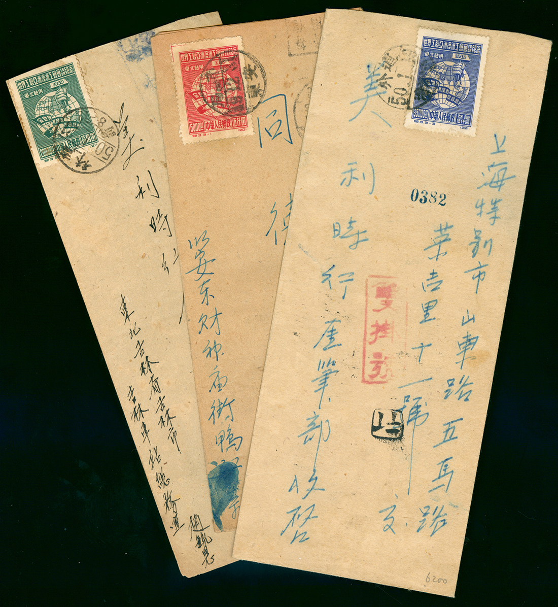 1949-50 Three NE PRC covers, each franked with a different NEC single, including a regis. Cover with $20,000., one double regis. Cover with $35,ppp.,one with $5,000. A rare set to complete.