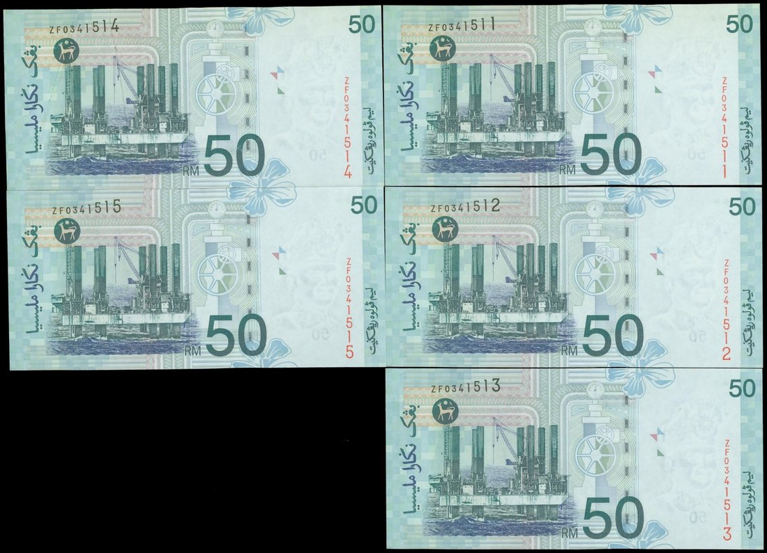 Malaysia, Bank Negara, a consecutive run of 5x 50 Ringgit, ND(1999-2001), replacement serial number ZF0341511 to 515, green and multicoloured, King Tuanku Abdul Rahman at right, watermark at left, oil platform on reverse,