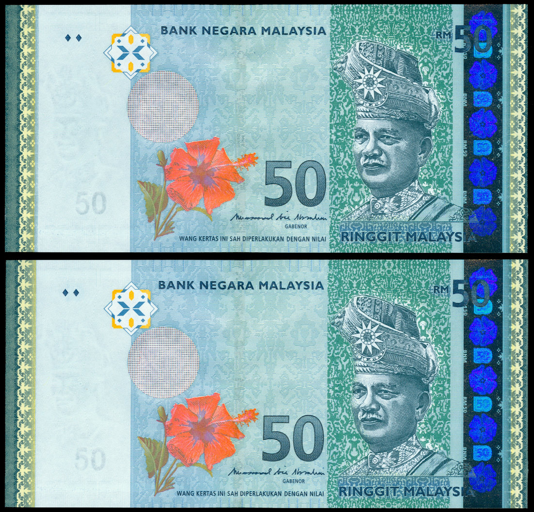 Malaysia, a consecutive pair of 50 ringgit, ND(2009), serial number LS 0577716-7, green-blue on multicolour underprint, Abdul Rahman at right, reverse blue-green, Malaysia's first Prime Minister declaring independence at right,