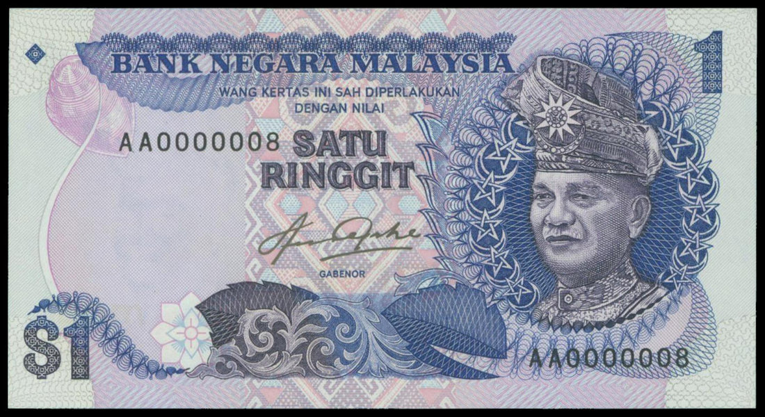 Malaysia, Bank Negara. 1 Ringgit, ND(1981-83), low serial numberAA0000008, purple, blue and multicoloured, King Tuanku Abdul Rahman at right, watermark at left, reverse national monument at centre,