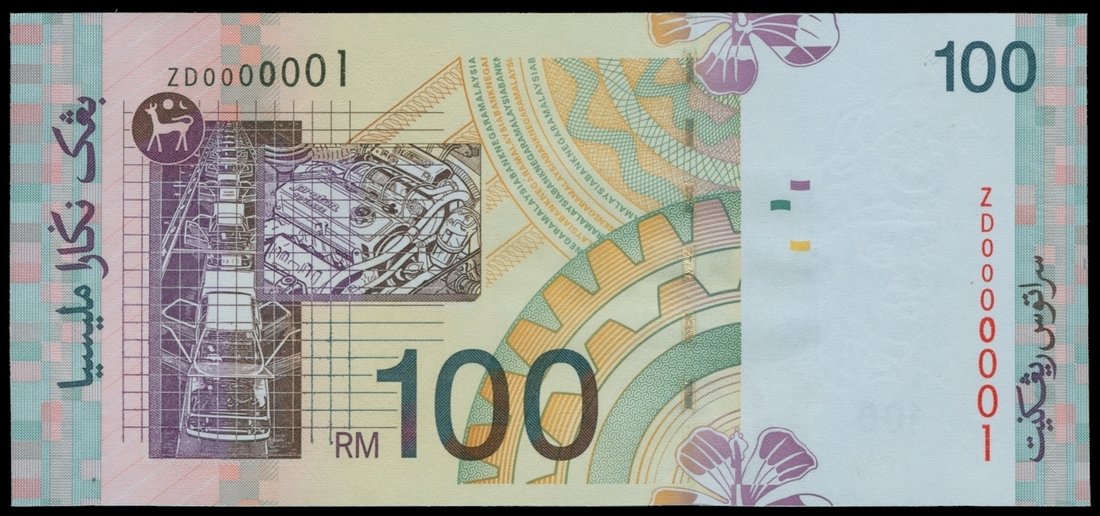 Malaysia, 100 ringgit, ND(2001), a very scarce replacement serial number 1 note, ZD 0000001, purple on multicolour underprint, Abdul Rahman at right, reverse multicoloured, automobile production theme at left,