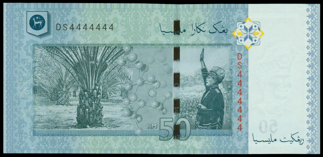 Bank Negara Malaysia, 50 Ringgit, ND(2009), solid serial DS4444444, green and multicoloured, King Tuanku Abdul Rahman at right, watermark at left, plantation on reverse,