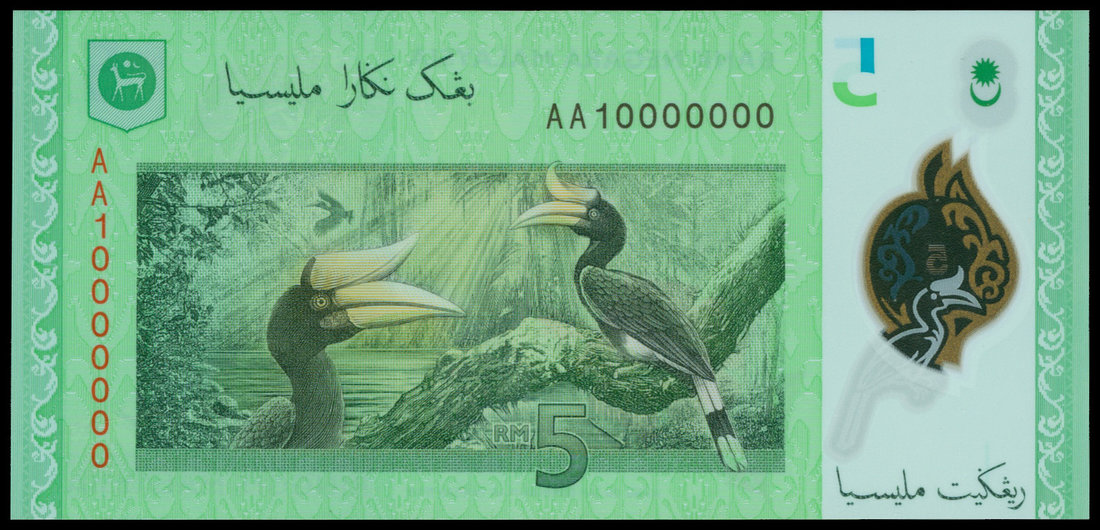 Malaysia, 5 ringgit, ND(2012), rare solid serial number AA 10000000, polymer note, black on green and red, Abdul Rahman at right, reverse green, a pair of Rhinocerus hornbills at centre,