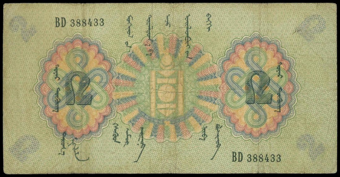 Commercial and Industrial Bank of Mongolia, 2 Tugrik, 1925, serial number BD388433, green and multicoloured, arms on at centre, vertical Mongolian script,