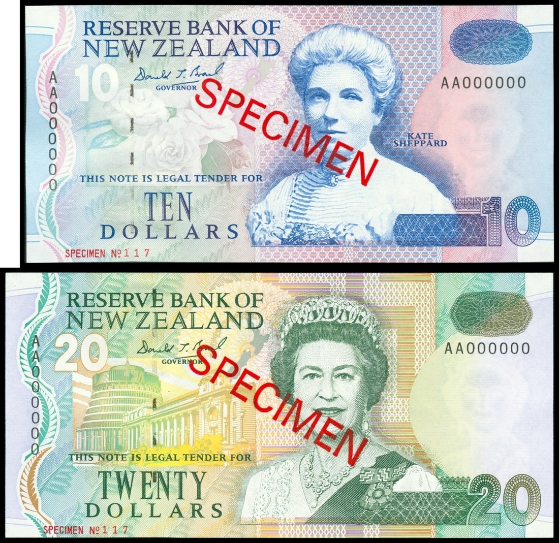 New Zealand, a pair of specimens, $10 and $10, no date, 1992, serial numbers AA000000, the $10 blue, featuring Kate Sheppard at right, the $20 green, Queen Elizabeth II at right, both have a specimen control number '117' at bottom left,