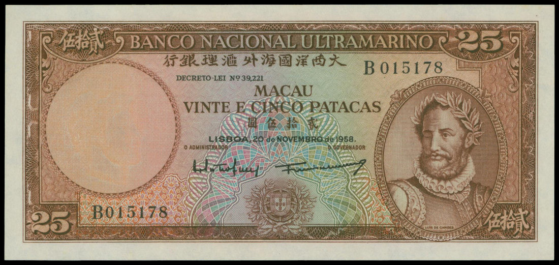 Banco Nacional Ultramarino, 25 patacas, 20.11.1958, serial number B015178, brown on light blue underprint, Camoes at right, arms at bottom centre, reverse brown, woman watching ships at centre, ship seal at left,