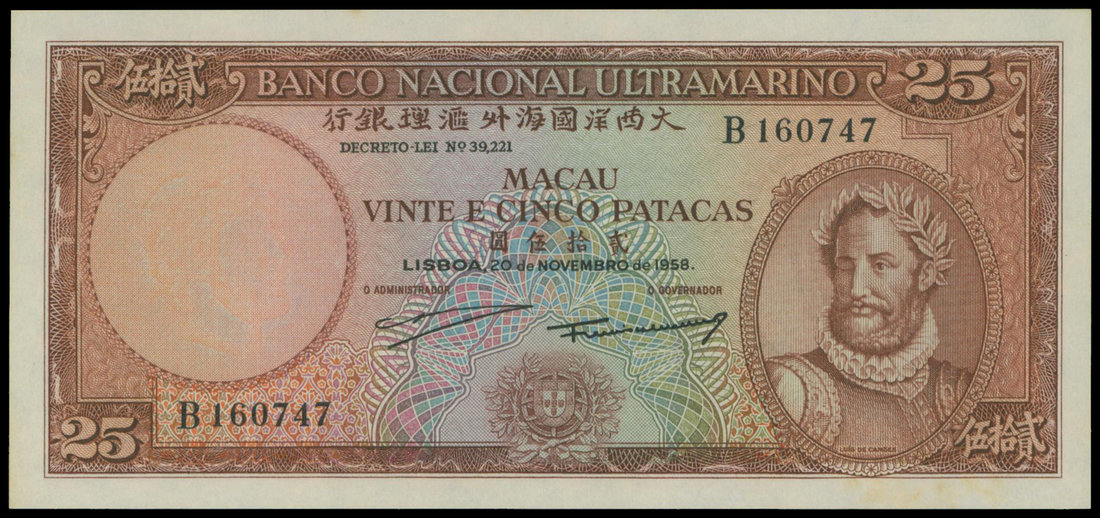 Macau, 25 patacas, 1958, serial number B160747, brown and multicolour, de Camoes at right, watermark of the same at left, reverse brown, maiden watching departing ships at centre, bank ship seal at left,