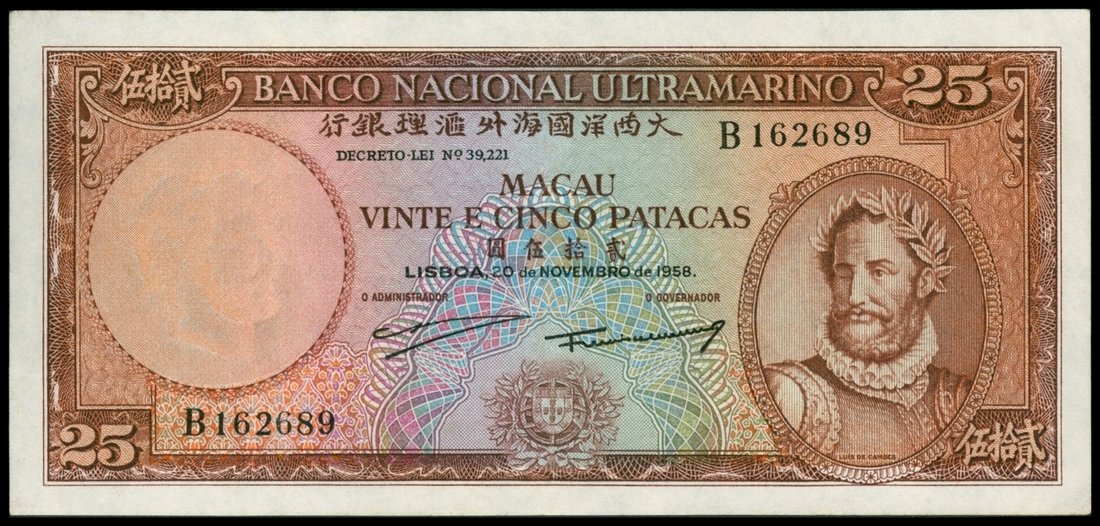 Macau, Banco Nacional Ultramarino, 25 patacas, 20.11.1958, serial number B162689, brown and multicoloured, Luis de Camoes at right, bank seal, a lady and ships on reverse,