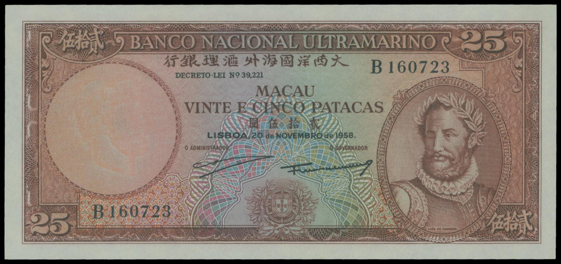 Banco Nacional Ultramarino, 25 patacas, 20.11.1958, serial number B160723, brown on light blue underprint, Camoes at right, arms at bottom centre, reverse brown, woman watching ships at centre, ship seal at left,