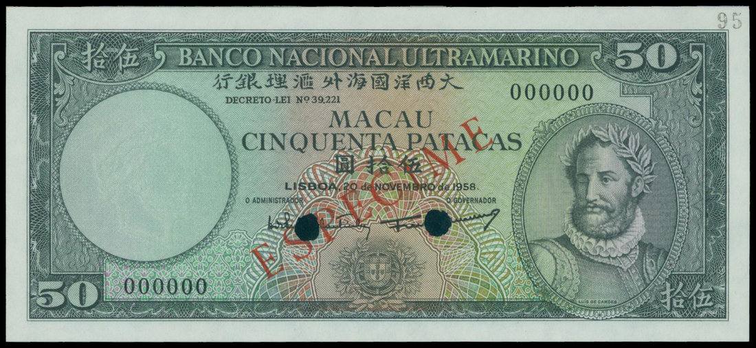 Banco Nacional Ultramarino, 50 patacas, specimen, 1958, black serial number 00000, olive on multicolour underprint, Camoes at right, watermark at left, reverse green, ship seal at left, woman facing ships at centre,