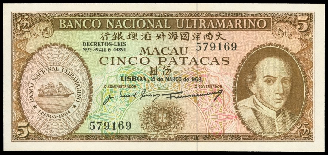 Banco Nacional Ultramarino, 5 patacas, 1968, serial number 579169, brown on multicolour underprint, Carneiro at right, ship seal at left, arms at bottom centre,