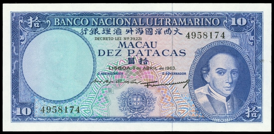 Banco Nacional Ultramarino, 10 patacas, 1963, serial number 4958174, blue on multicolour underprint, Carneiro at right, ship seal at left, arms at bottom centre,