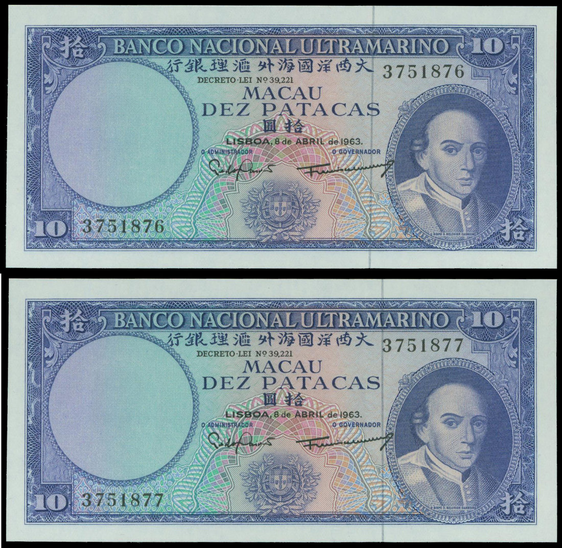 Macau, Banco Nacional Ultramarino, a consecutive pair of 10 patacas, 1963, serial numbers 3751876 to 3751877, blue on pale green, Carneiro at right, reverse blue and pink, maiden watching departing ships on reverse,