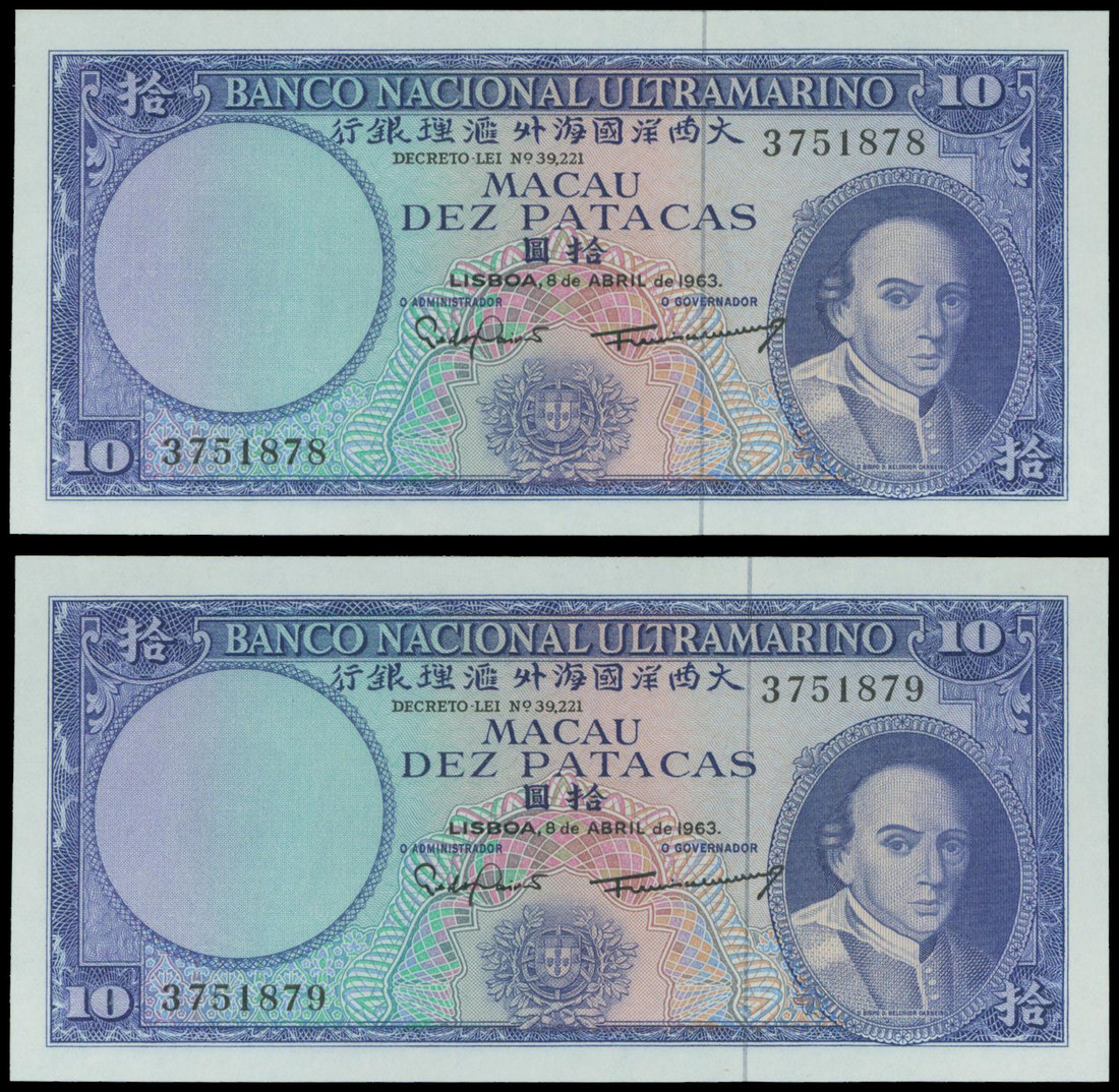 Macau, Banco Nacional Ultramarino, a consecutive pair of 10 patacas, 1963, serial numbers 3751878 to 3751879, blue on pale green, Carneiro at right, reverse blue and pink, maiden watching departing ships on reverse,