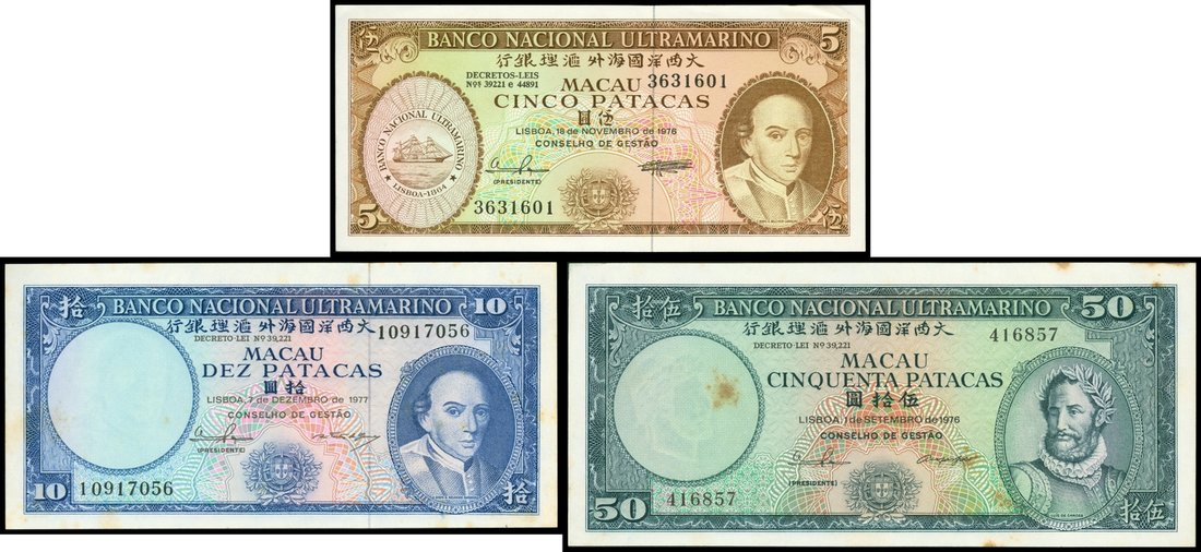 Macau, Banco Nacional Ultramarino, a set of 3 notes, 5, 10 and 50 patacas, 1976-1977, serial number 3631601, 10917056, 416857, brown, blue and green respectively,