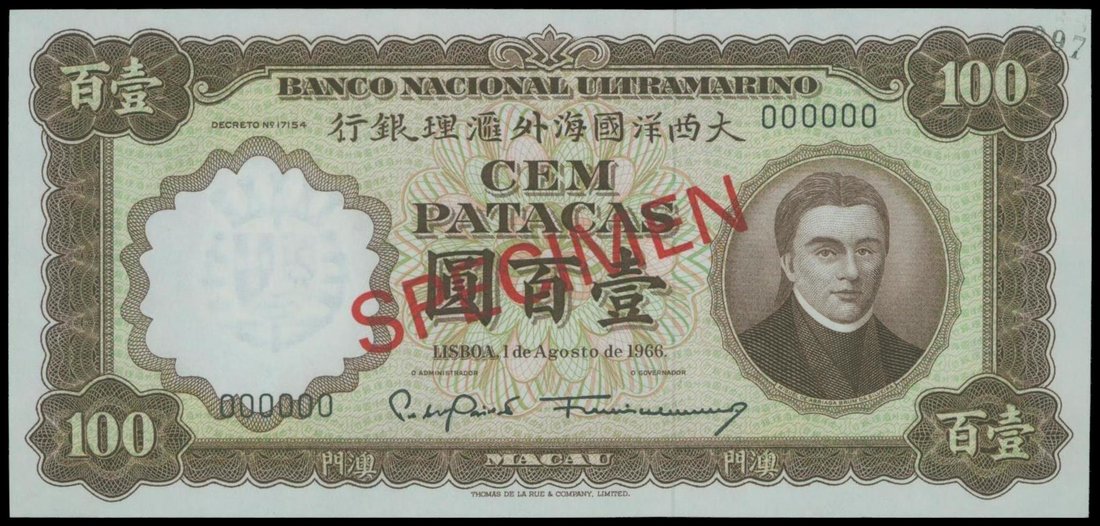 Macau, Banco Nacional Ultramarino, 100 patacas, specimen, 1.8.1966, serial number 000000, brown on green, Da Silveira at right, watermakr at left, reverse brown and green, flag on top of a stone archway at centre,