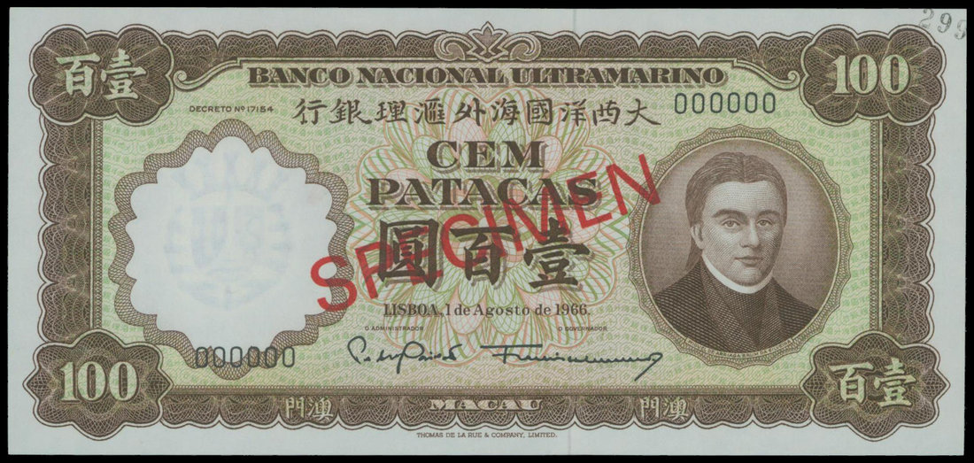 Macau, Banco Nacional Ultramarino, $100, specimen, 1.8.1966, serial number 000000, brown on gree, Da Silveira at right, watermark at left, reverse brown, green and pink, flag on top of a stone archwat at centre,