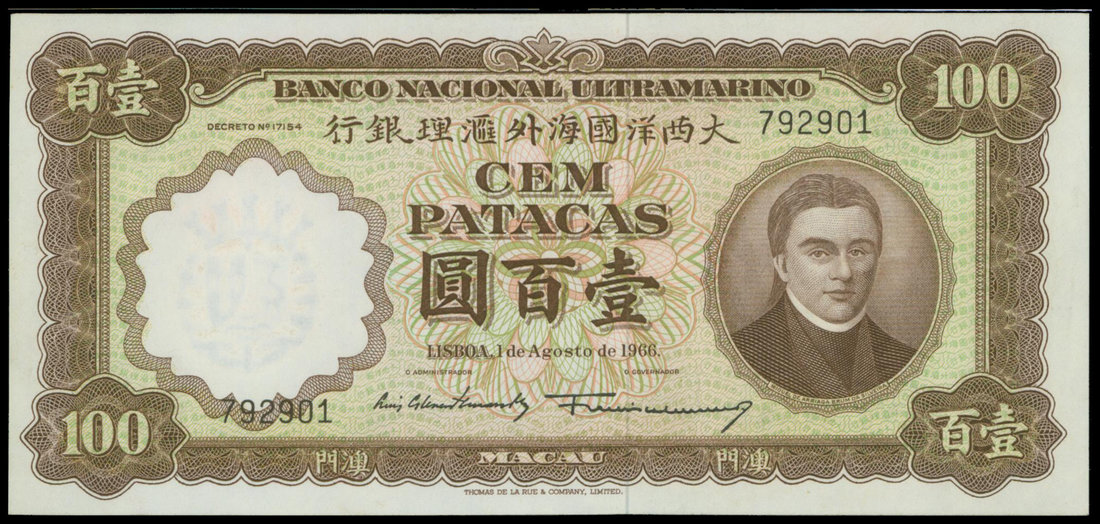 Macau, Banco Nacional Ultramarino, 100 patacas, 1.8.1966, serial number 792901, brown on light green and multicolour, Da Silveira at right, watermark of a crowned shield at left, reverse brown frame on light green and pink, stone archway with a flag on top,