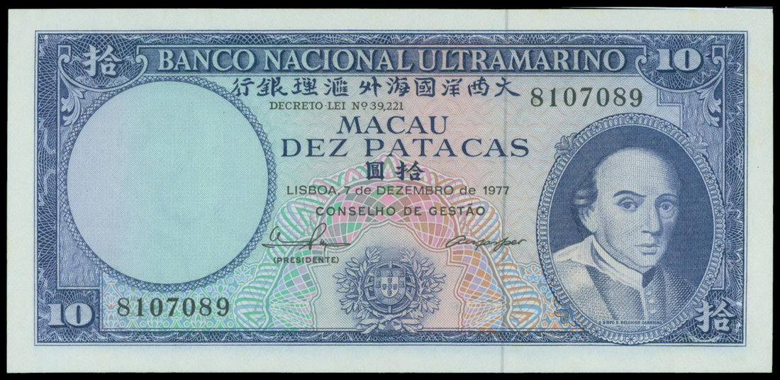 Macau, Banco Nacional Ultramarino, 10 patacas, 7.12.1977, serial number 8107089, blue on pink and turquoise, Carneiro at right, watermark at left, the reverse shows a maiden watching departing ships,