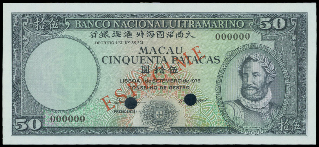 Banco Nacional Ultramarino, 50 patacas, specimen, 1976, black serial number 00000, olive on multicolour underprint, Camoes at right, watermark at left, reverse green, ship seal at left, woman facing ships at centre,