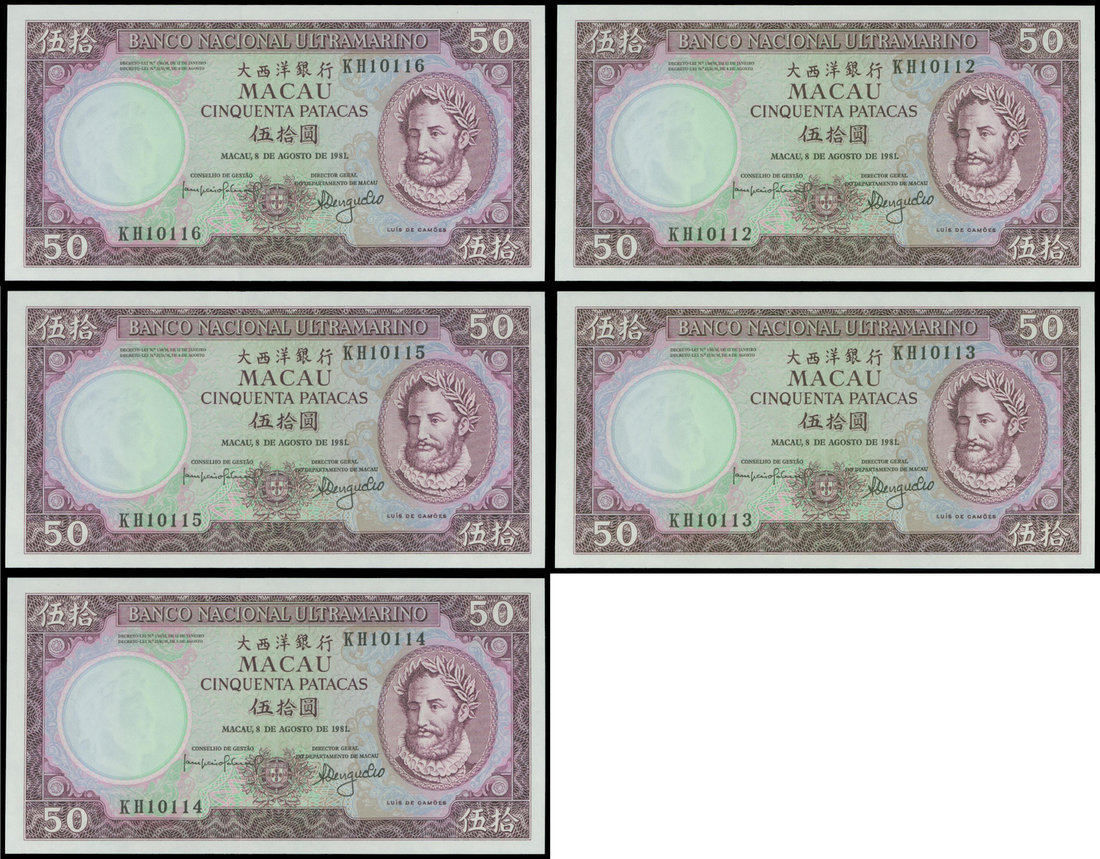 Macau, Banco Nacional Ultramarino, consecutive run of 5x 50 patacas, 1981, serial numbers KH10112 to KH10116, purple on pale green, Luis de Camoes at right, watermark area at left, view of Baia da Praia Grande on reverse,