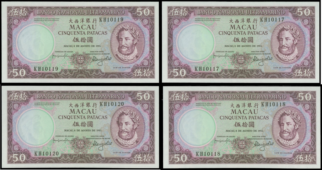 Macau, Banco Nacional Ultramarino, consecutive run of 4x 50 patacas, 1981, serial numbers KH10117 to KH10120, purple on pale green, Luis de Camoes at right, watermark area at left, view of Baia da Praia Grande on reverse,