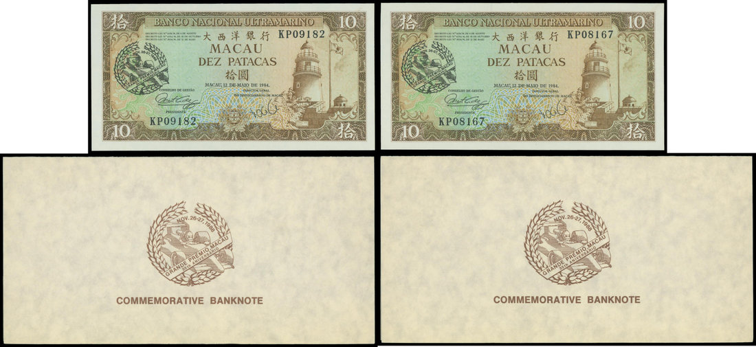 Macau, Banco Nacional Ultramarino, lot of 2x 10 patacas, 1988, serial numbers KP09182 and KP08167, with the black Grand Prix stamp on obverse and reverse,