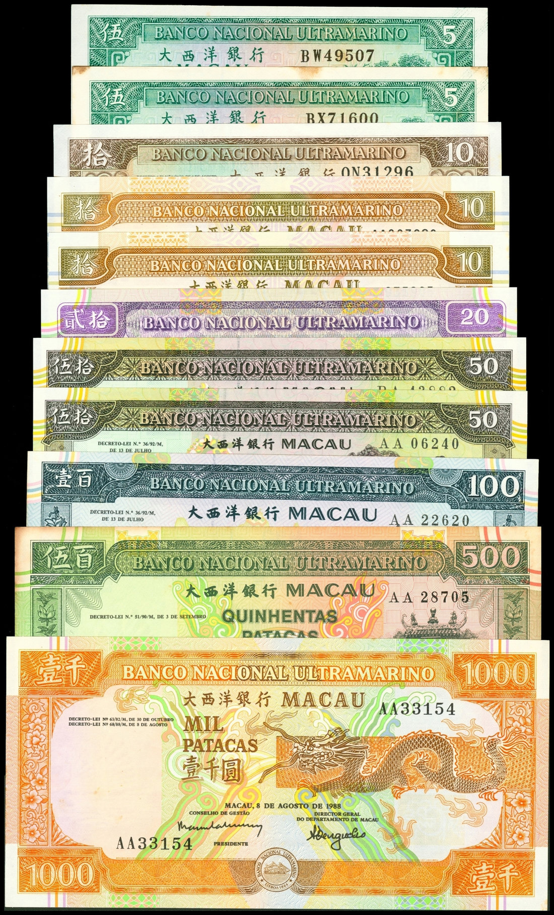 Macau, Banco Nacional Ultramarino, an assortment of 10 notes, 5 to 1000 patacas, 1981-1996, varying prefixes and serial number, (Pick 58-69), uncirculated with toning spots (10)