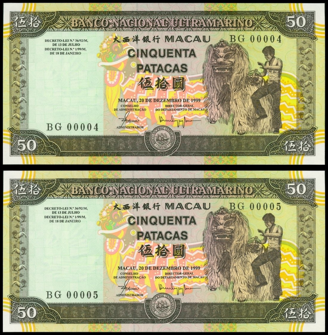 Macau, Banco Nacional Ultramarino, $50, 20.12.1999, a consecutive pair of low serial numbers BG00004 and BG00005, brown and multicolour, lion dancing scene at right, junk baot watermark at left, reverse brown, view of Macau,