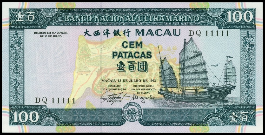Macau, Banco Nacional Ultramarino, $100, 1992, lucky serial DQ 11111, dark green and multicoloured, junk at right, Governador Nobre de Carvalho Bridge on reverse,